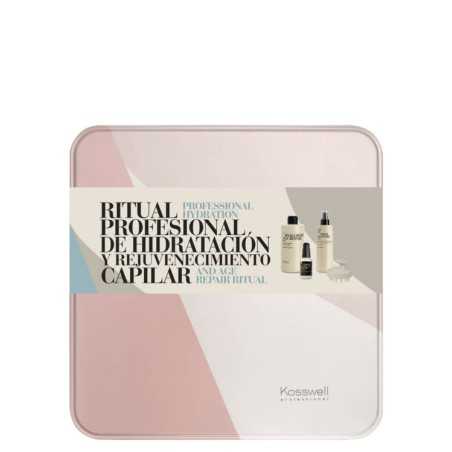 Pack profesional de Kosswell que integra champú, tratamiento leave‑in, sérum nocturno y masajeador capilar, diseñado para cabello seco, deshidratado o envejecido. Aporta hidratación profunda, elasticidad, brillo y fortalecimiento desde la raíz hasta las puntas.